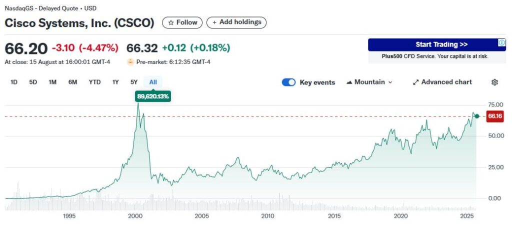 Even after the dot com boom and bust, 2008, 2020 you’d still be up 89,620% on Cisco. Yep, that turns £100 quid into £896,200.