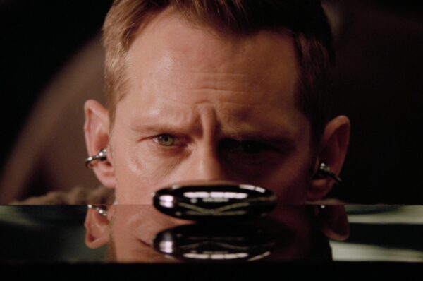 It’s a silver metallic looking mirror finish orb. With similar textured earbuds, nicely settled in the ears of Alexander Skarsgård.