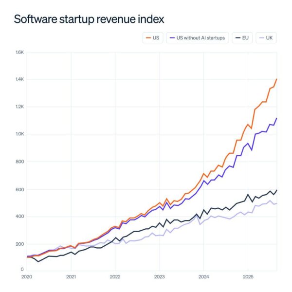Since mid-2023, U.S. software startups have significantly accelerated and widened the gap from UK and European peers.