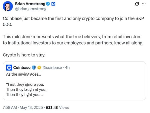 Coinbase (NASDAQ:COIN) has just been added to the S&P 500. It has met all the criteria for inclusion, and it is officially the first and only crypto company in the index.