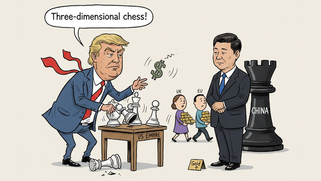 The first order effects are unmistakable; the American empire grows more isolated…and weaker. But the Trump Team is said to be looking beyond the obvious consequences…it is supposed to be playing ‘three-dimensional chess’ or looking at ‘third order effects.’.