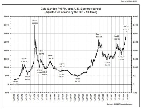 The 1980 inflation-adjusted gold price high was $3,486.11, according to TheChartStore.com